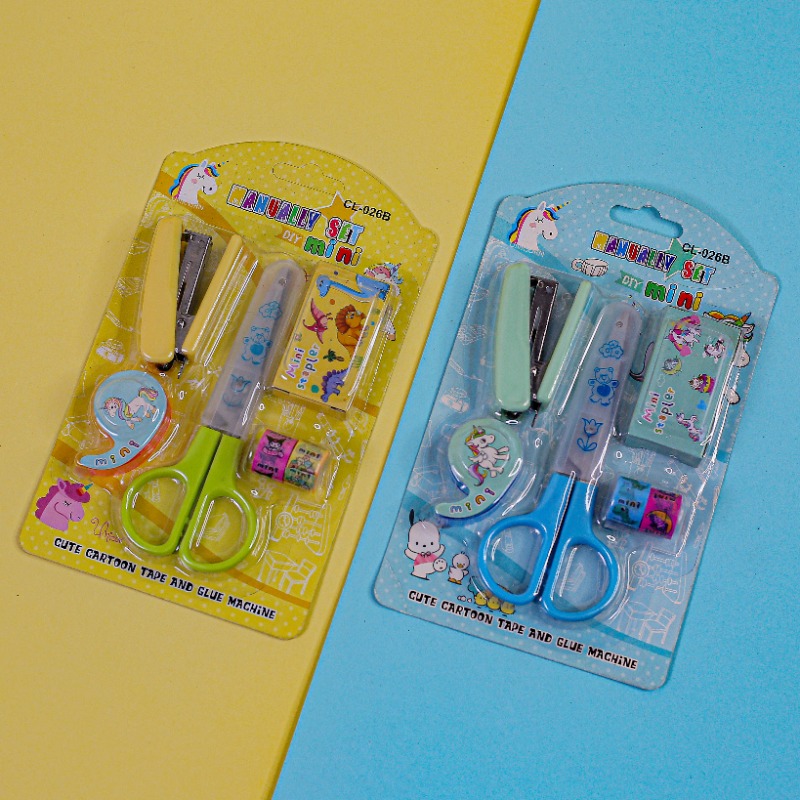 Each set is attractively packaged, making it ideal for children, especially those who love dinosaurs. The packaging is labeled as a “Cute Cartoon Tins and Glue Machine. 5 in 1 stationery kit, For school going boys and girls, Best for birthday gifts Stationery organizer kit include 2 designer tapes, a dispenser, a scissor, stapler pins.